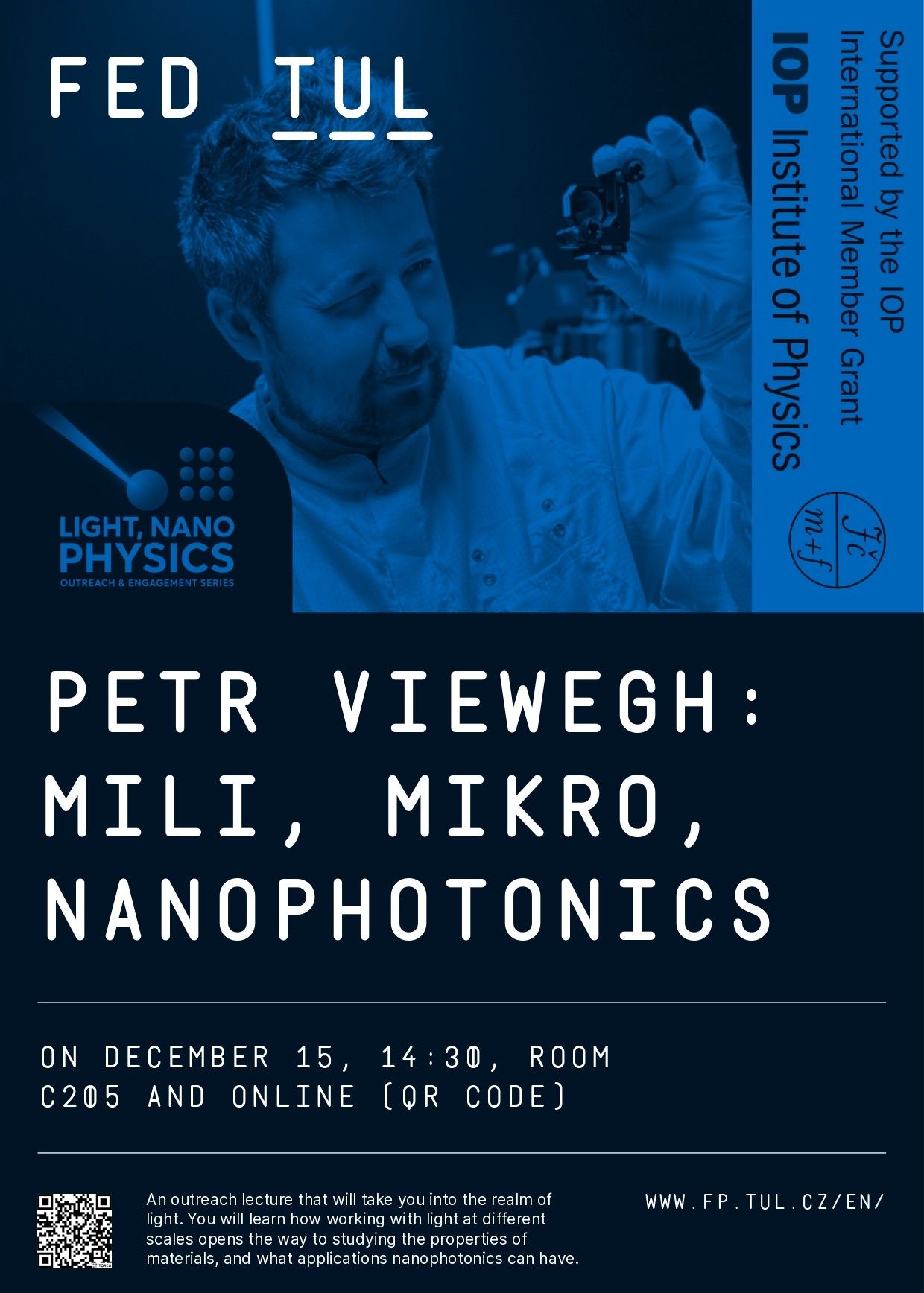Katedra fyziky, katedra chemie TUL a JČMF, pobočný spolek Liberce, pořádají přednášku, která vás zavede do říše světla. Dozvíte se, jak nám práce se světlem v různých měřítkách otevírá cestu ke studiu vlastností materiálů a jaké aplikace nanofotonika může mít.