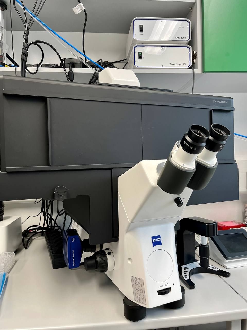 Fluorescenční mikroskop je optický mikroskop využívající fluorescenci k zobrazení organických i anorganických struktur. Zároveň náš mikroskop má vše, co potřebujete k udržení buněk v přirozeném stavu – live cell imaging. Inkubátor zajišťuje optimální fyziologické podmínky pro živé buněčné kultury, jako je stabilita systému, vlhkost, teplota a hladina oxidu uhličitého.